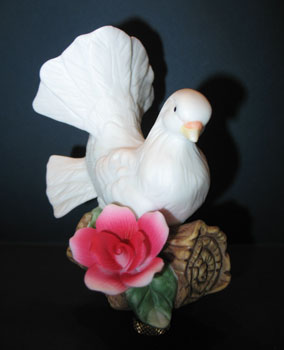 Finial: Graceful White Dove on a Log with Rose. 4" overall