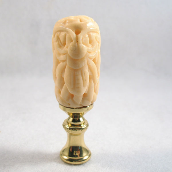 Lamp Finial, Carved bone off white cylinder with bug. Fits harp. brass hardware. measures 2 1/2" overall