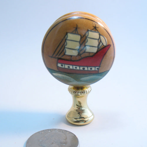 Lamp Finial Hand Painted Sailing Ship Wooden Disk