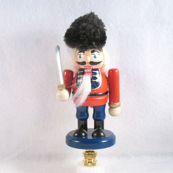 Lamp Finial: Christmas nutcracker. Wooden, hand painted. Measures 5" tall overall. Fits standard lamp harp.
